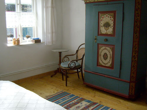 - Das Schlafzimmer (16 m²) ist mit breitem Doppelbett und einem antiken Schrank eingerichtet.